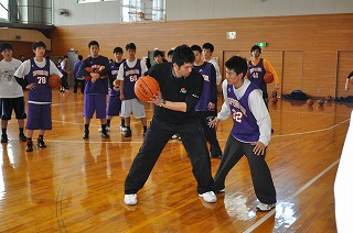 日時 平成25年 3月24日(月) 9:00〜12:00 場所 稚内市緑体育館 対象 高校男女バスケットボール部員 参加 47人 講師 佐久本 智 氏(札幌大学バスケットボール部コーチ)